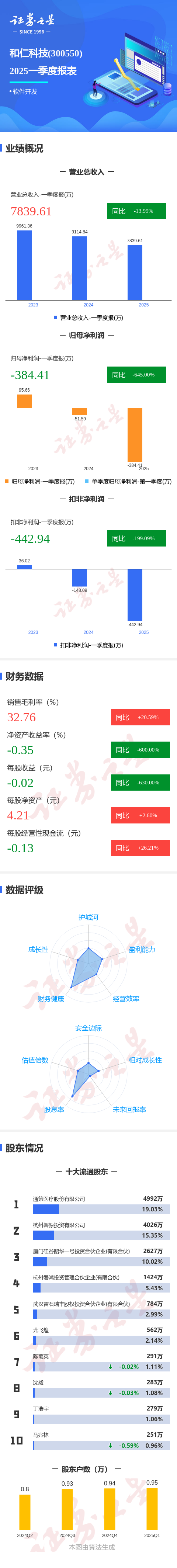 证券之星消息,和仁科技2025年一季报显示,公司主营收入7839.61万元,同比下降13.99%;归母净利润-384.41万元,同比下降645.0%;扣非净利润-442.95万元,同比下降199.1%;负债率21.46%,投资收益5.42万元,财务费用-24.79万元,毛利率32.76%。