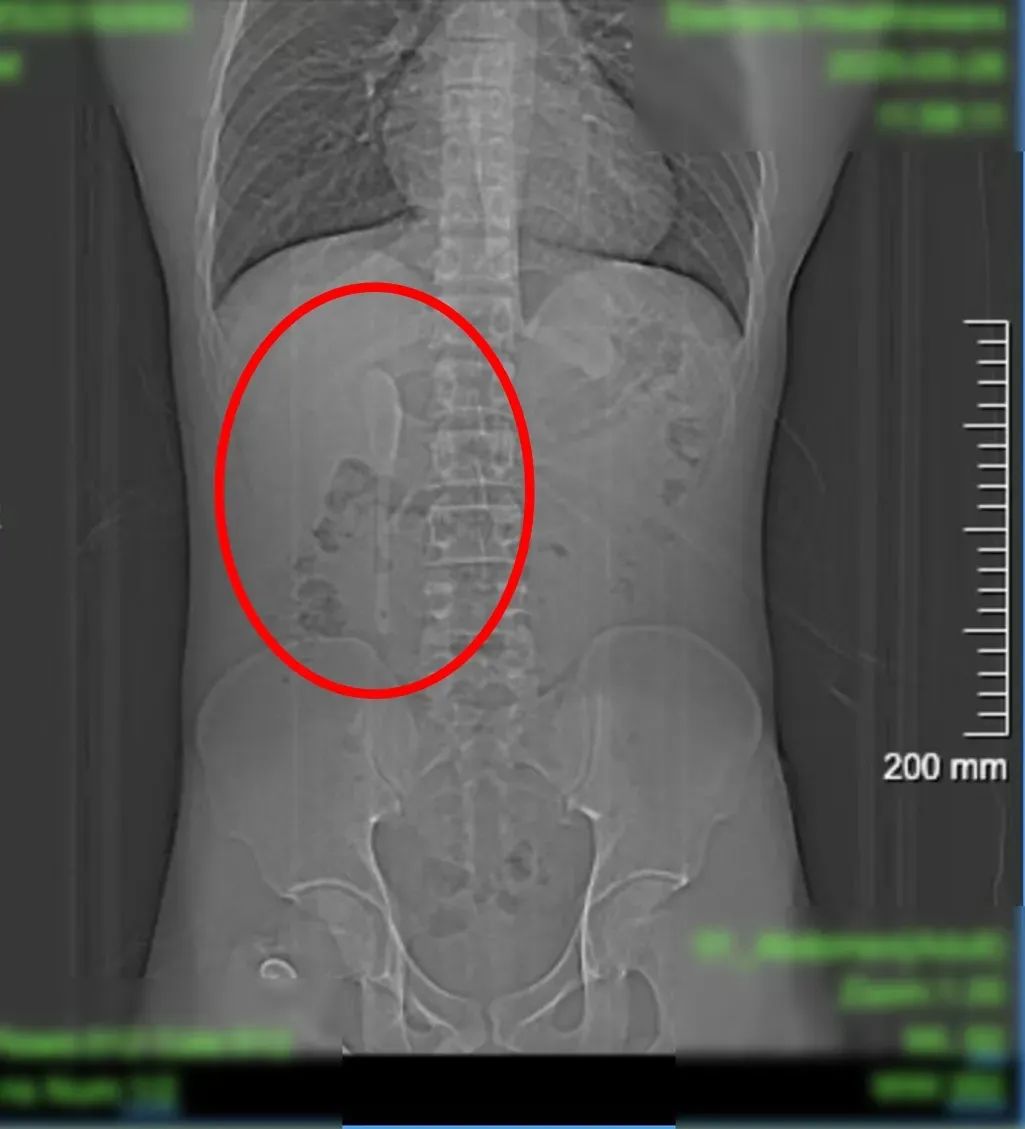 6月18日下午,小言被推进了内镜手术室。虽然团队对手术难度有所预判,但内镜画面仍让团队倒吸凉气——勺子的“头”卡在十二指肠球部,而它的“长柄”则一路延伸下去,拐了个弯卡在了更深的十二指肠降部与水平部交界处。勺子表面太光滑,又长又硬,卡的角度刁钻,好不容易圈套器圈住了柄部,一用力,就从光滑的勺面脱了出来……套不住,根本套不住!圈套器反复滑脱,异物钳难以抓牢光滑勺面。
